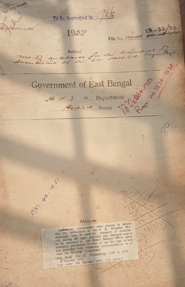 | Rack No. 10, Bundle No. 125 Sl No. 10377 Grant to dispensaries for the year 1950-51, Dacca Division. | Rack No. 10, Bundle No. 125 Sl No. 10378 Sanction the purchase of an Underwood typewriter for urgent use in the Chemical Examiner's Department. | Rack No. 10, Bundle No. 125 Sl No. 10379 Arrangement for the use of Govt. Vehicles and steam launch by the Inspector of Hospital, Bakerganj Range. | Rack No. 10, Bundle No. 125 Sl No. 10380 Use of the ambulance for the treatment of Anesthetist of the S.K. Hospital, Mymensingh. | Rack No. 10, Bundle No. 125 Sl No. 10382 Retention of the post of Cachir, Dacca Medical School. | Rack No. 10, Bundle No. 126 Sl No. 1036 House rent allowance to Dr. Mrs. Zohara Begum Kazi H.P. to additional Physician Dacca Medical, College Hospital. | Rack No. 10, Bundle No. 126 Sl No. 10381 Meeting of the central medical Board to the held at Dacca Karachi and Lahore on 12th-14th and 16th Sept "53 Aeration to Dr. Refatullah to attend the meeting. |
