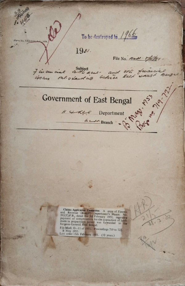 | Rack No. 10, Bundle No. 122, Sl No. 10066 Govt. order regarding drawal of transfer travelling allowance bill by Colonel M.K. Afridi P.M.S. Surgeon General E. Bengal. | Rack No. 10, Bundle No. 122, Sl No. 10067 Certain improving to therapy room and X-ray room etc of X-ray department in the medical C.H. Dacca. | Rack No. 10, Bundle No. 122, Sl No. 10068 Grant of house building advance of Rs. 5220/- for A.S. Dr. M.A. Qusem. | Rack No. 10, Bundle No. 122, Sl No. 10069 Claims Application committee, Finance and revenue between East and West Bengal. | Rack No. 10, Bundle No. 122, Sl No. 10070 Improvement to the Sadar Hospital at Rangpur and the Sub-Divisional hospital Nalphemari Gaibanda Kurigram. | Rack No. 10, Bundle No. 122, Sl No. 10071 Improvement of the Sadar Hospital Danajpur resolution of the Visiting committee about. | Rack No. 10, Bundle No. 122, Sl No. 10072 Maintenance Charge of War Criminal mental Patient N.R. Sen Majumder. |