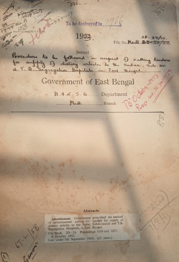 | Rack No. 10, Bundle No. 126 Sl No. 10384 Advertisement Charge. | Rack No. 10, Bundle No. 126 Sl No. 10385 Inspection report of the accounts of Feni govt. Hospital for the year 1949-50. | Rack No. 10, Bundle No. 126 Sl No. 10387 Permission to female 3rd division matriculates candidates for admission to the Medical, School East Bengal. | Rack No. 10, Bundle No. 126 Sl No. 10388 Procedure to the followed in respect of calling tenders for supply of dietary articles to the Sadar, Sub-division and T.B. Segregation Hospital in East Bengal. | Rack No. 10, Bundle No. 126 Sl No. 10389 Permission to the Midwives of the Sadar and Sub-Divisional Hospital to do the Private Practice. | Rack No. 10, Bundle No. 126 Sl No. 10390 Dr. Kazi Abul Mansur Senior Clinical Pathologist Medical College Hospital Dacca. | Rack No. 10, Bundle No. 126 Sl No. 10391 Supply of full quota of ration in terms of Rice for hospitals patients. |