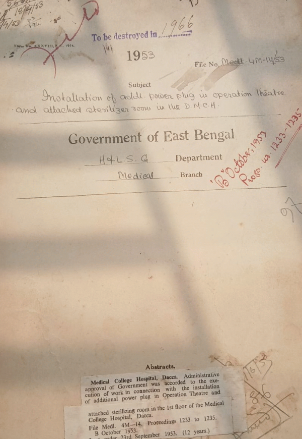 | Rack No. 10, Bundle No. 126 Sl No. 10394 T.A. of Mvi. Md. Musa Khan, Rural Health Inspector. | Rack No. 10, Bundle No. 126 Sl No. 10395 Shipping of Dohazari Rural dispensary from its present location to Hashimpur. | Rack No. 10, Bundle No. 126 Sl No. 10396 Provident fund money of Mrs. Monomahini Dutta, ex-female nurse Patuakhali Begum Hospital, Barisal. | Rack No. 10, Bundle No. 126 Sl No. 10397 Installation of additional power plug in operation theater and attached sterilizing room in the D.N.C. H. | Rack No. 10, Bundle No. 126 Sl No. 10398 Extension of retaining wall and brief patenting to stop gradual cession of the Khal on the eastern side of the Dacca, Medical School. | Rack No. 10, Bundle No. 126 Sl No. 10399 Provision of flushing arrangements for the septic tank latrine at Sadar and S. Divisional Hospital. | Rack No. 10, Bundle No. 126 Sl No. 10400 Payment of bills of M/S. Taqu Butt and Co. Mobile Units and Refrigerator. |