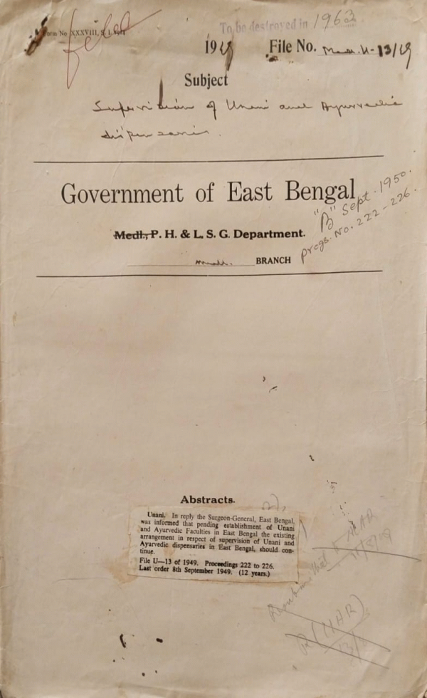 | Rack No. 09, Bundle No. 103, SI No. 8200 Establishment of thana and Rural Dispensaries an provincialisation of district health and medical Service. | Rack No. 09, Bundle No. 103, SI No. 8201 Establishment of state Dispensaries Jagadishpur instead madhabpur thana dispensary Sylhet. | Rack No. 09, Bundle No. 103, SI No. 8202 Exemption of Dr. Md. Safiullah Radiologist Dacca Mitford Hospital from attending P.G Course of training and to allowance him to | Rack No. 09, Bundle No. 103, SI No. 8203 Supervision of Unani and Ayurvedic dispensaries. | Rack No. 09, Bundle No. 103, SI No. 8204 Application from Dr. W. Mahmood D.S.G. E.B for his appointment in the Second selection grad with effect from 15.8.47. | Rack No. 09, Bundle No. 103, SI No. 8205 Collection of fee from Patients attending outdoor dispensaries. | Rack No. 09, Bundle No. 103, SI No. 8206 Recruitment of German Technicians. |