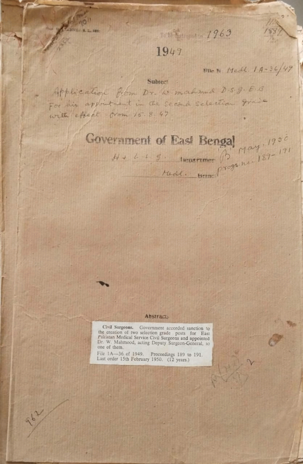 | Rack No. 09, Bundle No. 103, SI No. 8201 Establishment of state Dispensaries Jagadishpur instead madhabpur thana dispensary Sylhet. | Rack No. 09, Bundle No. 103, SI No. 8202 Exemption of Dr. Md. Safiullah Radiologist Dacca Mitford Hospital from attending P.G Course of training and to allowance him to | Rack No. 09, Bundle No. 103, SI No. 8203 Supervision of Unani and Ayurvedic dispensaries. | Rack No. 09, Bundle No. 103, SI No. 8204 Application from Dr. W. Mahmood D.S.G. E.B for his appointment in the Second selection grad with effect from 15.8.47. | Rack No. 09, Bundle No. 103, SI No. 8205 Collection of fee from Patients attending outdoor dispensaries. | Rack No. 09, Bundle No. 103, SI No. 8206 Recruitment of German Technicians. | Rack No. 09, Bundle No. 103, SI No. 8207 Grant of house Rent allowance of K.A. Rahman (Compounder). |