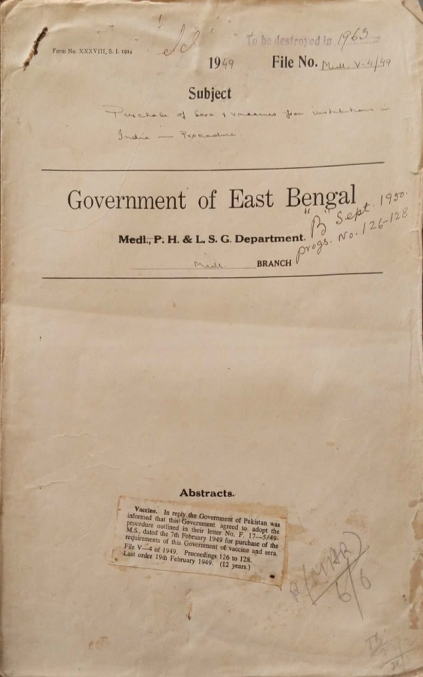 | Rack No. 09, Bundle No. 103, SI No. 8210 Addition to and alterations in the ground floor of the central block of Dacca Medical College and Hospital in connection with the Proposed X-ray Department. | Rack No. 09, Bundle No. 103, SI No. 8211 Special sanction for Advertisement charges for Rs. 700/- (Rupees Sever hundred) only. | Rack No. 09, Bundle No. 103, SI No. 8212 Combined scheme of Health and Medical Services for Rural areas. | Rack No. 09, Bundle No. 103, SI No. 8213 Purchase of Sera and Vaccine form Institutions in India Procedure. | Rack No. 09, Bundle No. 103, SI No. 8214 Index (Res.) Card of Ex nursing orderly Dhirendra Nath Das. | Rack No. 09, Bundle No. 103, SI No. 8215 To obtain revalidation order for payment of the bill No. MSR/8 dated 28.3.49 for Rs. 289-10-0 during this current financial year under head medical and Surgical Requisites. | Rack No. 09, Bundle No. 103, SI No. 8216 Use of Reserve store building at Tangail. |