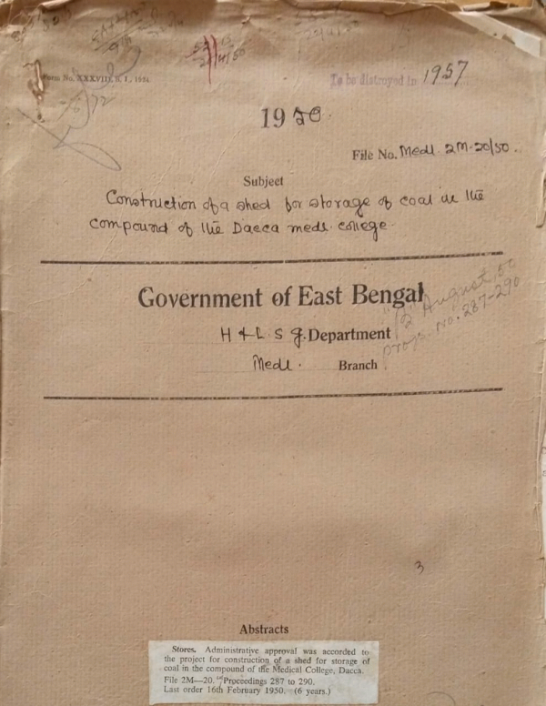 | Rack No. 09, Bundle No. 103, SI No. 8216 Use of Reserve store building at Tangail. | Rack No. 09, Bundle No. 103, SI No. 8217 Retention of the post of Laboratory Assistants in the medical School at Mymensingh and Chittagong. | Rack No. 09, Bundle No. 103, SI No. 8218 Supply of medical and non medical equipment to the Jail Hospital under the Inspector General of prisons Govt. of E.B. | Rack No. 09, Bundle No. 103, SI No. 8219 Construction of a Shed for storage of Coal in the compound of the medical college Dacca. | Rack No. 09, Bundle No. 103, SI No. 8220 Extra remuneration of to Dr. Md. Belayat Hossain, Assistant Surgeon, Sadar Hospital Khulna during which he held civil surgeon of Khulna in addition to his own duties. | Rack No. 09, Bundle No. 106, Sl No. 5877 Sanction of Rs. 650/- for the purchase of stationery articles of the Dacca Medical College. | Rack No. 09, Bundle No. 106, Sl No. 5878 Procedure to information's to accrual govt. through |