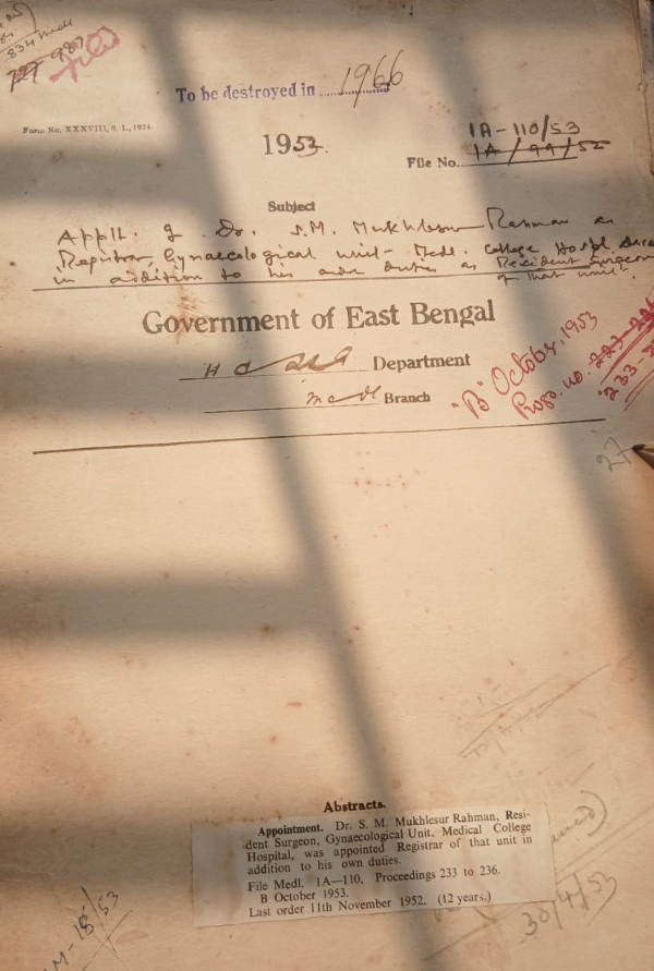 | Rack No. 10, Bundle No. 126 Sl No. 10424 Management of the Homeopathy charitable dispensary maintenance by the Dacca District Board at Beraid. | Rack No. 10, Bundle No. 126 Sl No. 10425 Assembly Question by Mr. Ali Ahmed Khan M.L.A. regarding Radiologist treatment in the Medical College Hospital Dacca. | Rack No. 10, Bundle No. 126 Sl No. 10426 Payment of Arrear Bill. | Rack No. 10, Bundle No. 126 Sl No. 10427 Appointment of Dr. S.M. Mukhlesur Rhaman, Registers Gynecological Unit Medical College Hospital Dacca in addition to his own duties. | Rack No. 10, Bundle No. 126 Sl No. 10428 Payment of advertisement bill in con. with filling up of the post of Instrument ledger clerk medical College Hospital Dacca. | Rack No. 10, Bundle No. 126 Sl No. 10429 Sanction to the retention of the post of Anesthetist for the general Hospital Chittagong. | Rack No. 10, Bundle No. 126 Sl No. 10430 Proposal for the setting up of post graduate medical institution. |
