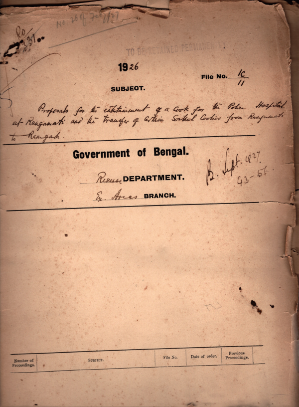 Proposals for the entertainment of a cook for the police Hospital of Rangamati and the transfer of Certain Sonthal cookies from Rangamati to Ramganj.