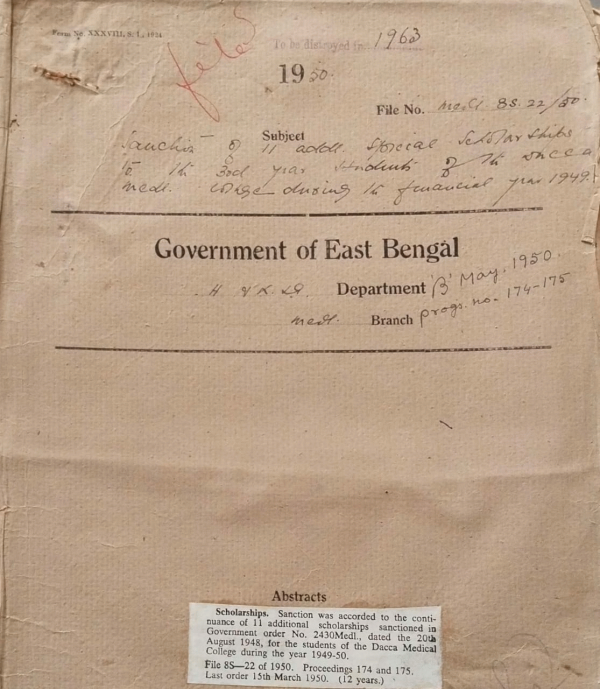 | Rack No. 09, Bundle No. 103, SI No. 8222 Press of Registration of Books Act 1867 (XXV of 1867) adapted by Pakistan. | Rack No. 09, Bundle No. 103, SI No. 8223 Providing fly proof wire netted ventilators R.C. Shelf et in Kitchen attached to medical college and hospital, Dacca. | Rack No. 09, Bundle No. 103, SI No. 8224 Control in habit farming drugs of the Balanchine and Amidone types. | Rack No. 09, Bundle No. 103, SI No. 8225 Sanction of Additional Special Scholarships to the 3rd year students of the Dacca Medical college during the year 1949-50. | Rack No. 09, Bundle No. 103, SI No. 8226 Provincialisation of medical and public Helath Service. | Rack No. 09, Bundle No. 103, SI No. 8227 Sanction for payment of bills relating to the last financial year. | Rack No. 09, Bundle No. 103, SI No. 8228 List of Drawing and Disbursing Officers. |