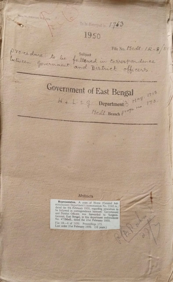 | Rack No. 09, Bundle No. 103, SI No. 8236 Provincialisation of P.H. and Medical Services in the District Board Pabna. | Rack No. 09, Bundle No. 103, SI No. 8237 Retention of the temporary of Post of Hakim in the Tibbiyan College, Sylhet. | Rack No. 09, Bundle No. 103, SI No. 8238 Checking of non-medical Stores of the S.K. Hospital Mymensingh. | Rack No. 09, Bundle No. 103, SI No. 8239 Procedure to be followed in correspondence between govt. and District officers. | Rack No. 09, Bundle No. 103, SI No. 8240 Leave of Dr. Zulfiquer Ali Chowdhury Teacher of medical Jurisprudence Sylhet Medical School. | Rack No. 09, Bundle No. 103, SI No. 8241 Sanction to the Purchase of either the "British Medical Journal" of the "Caneet" at a cost of Rs. 21/- in place of the I.M. Gazette" at a cost of Rs. 17/-. | Rack No. 09, Bundle No. 103, SI No. 8242 Verification rolls of Assistant Surgeon Dr. Md. Habibur Rahman. |