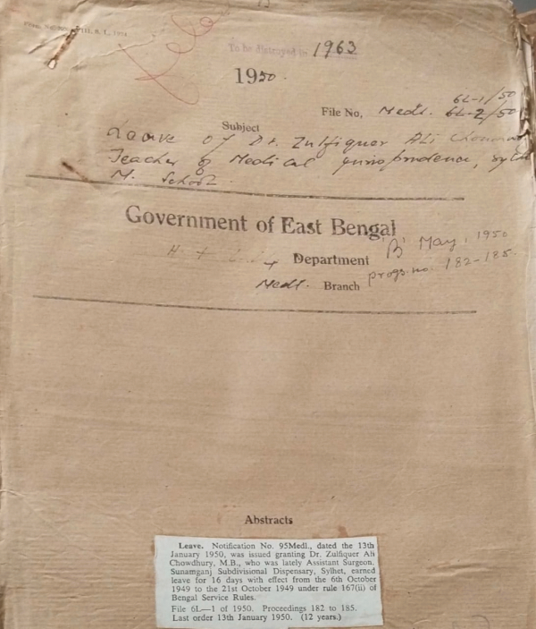 | Rack No. 09, Bundle No. 103, SI No. 8237 Retention of the temporary of Post of Hakim in the Tibbiyan College, Sylhet. | Rack No. 09, Bundle No. 103, SI No. 8238 Checking of non-medical Stores of the S.K. Hospital Mymensingh. | Rack No. 09, Bundle No. 103, SI No. 8239 Procedure to be followed in correspondence between govt. and District officers. | Rack No. 09, Bundle No. 103, SI No. 8240 Leave of Dr. Zulfiquer Ali Chowdhury Teacher of medical Jurisprudence Sylhet Medical School. | Rack No. 09, Bundle No. 103, SI No. 8241 Sanction to the Purchase of either the "British Medical Journal" of the "Caneet" at a cost of Rs. 21/- in place of the I.M. Gazette" at a cost of Rs. 17/-. | Rack No. 09, Bundle No. 103, SI No. 8242 Verification rolls of Assistant Surgeon Dr. Md. Habibur Rahman. | Rack No. 09, Bundle No. 103, SI No. 8243 Payment of advance to the employees of the govt. of Pakistan stranded in India by the High Commissioner for Pakistan in India, New Delhi. |