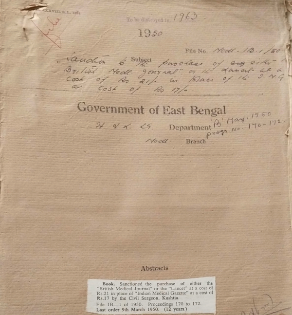 | Rack No. 09, Bundle No. 103, SI No. 8238 Checking of non-medical Stores of the S.K. Hospital Mymensingh. | Rack No. 09, Bundle No. 103, SI No. 8239 Procedure to be followed in correspondence between govt. and District officers. | Rack No. 09, Bundle No. 103, SI No. 8240 Leave of Dr. Zulfiquer Ali Chowdhury Teacher of medical Jurisprudence Sylhet Medical School. | Rack No. 09, Bundle No. 103, SI No. 8241 Sanction to the Purchase of either the "British Medical Journal" of the "Caneet" at a cost of Rs. 21/- in place of the I.M. Gazette" at a cost of Rs. 17/-. | Rack No. 09, Bundle No. 103, SI No. 8242 Verification rolls of Assistant Surgeon Dr. Md. Habibur Rahman. | Rack No. 09, Bundle No. 103, SI No. 8243 Payment of advance to the employees of the govt. of Pakistan stranded in India by the High Commissioner for Pakistan in India, New Delhi. | Rack No. 09, Bundle No. 103, SI No. 8244 Fixation of pay of Dr. Md. Khabyr Civil Surgeon Bakarganj. |