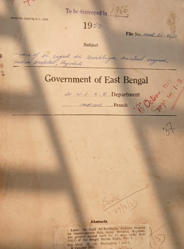 | Rack No. 10, Bundle No. 126 Sl No. 10434 Petition from Mr. Shahjahan Karim for financial help from the govt. for studies in the United State of America. | Rack No. 10, Bundle No. 126 Sl No. 10435 Addition and alternation to the existing A.G. Structures for conversion into nurse quarters at Rangpur. | Rack No. 10, Bundle No. 126 Sl No. 10436 Sanction to the continuance of the Scheme for the training of Pupil-nurse at the Preliminary training school in East Bengal. | Rack No. 10, Bundle No. 126 Sl No. 10437 Leave of Dr. Sajid Ali Barbuiya, Assistant Surgeon Sadar Hospital, Rajshahi. | Rack No. 10, Bundle No. 126 Sl No. 10438 Improvement of drainage system in the Sadar Hospital at Barisal. | Rack No. 10, Bundle No. 126 Sl No. 10439 House building advance to Dr. Md. Saifullah, Resident Surgeon, Mitford Hospital, and Dacca. | Rack No. 10, Bundle No. 126 Sl No. 10440 Mental Patient Prafulla Kumar Dutta Convict NO. 9596 Now confined in Dacca Central Jail. |