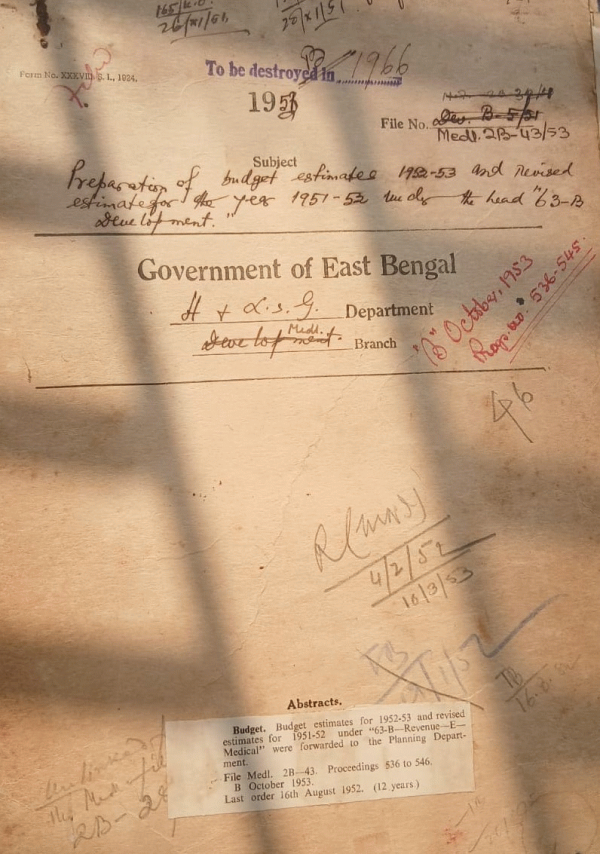 | Rack No. 10, Bundle No. 126 Sl No. 10443 A.Q. by Mrs. Anwara Khatun, M.L.A. beg. the numbers of outpatients Department for out-door treatment of Patients at the M.C.H.D. | Rack No. 10, Bundle No. 126 Sl No. 10444 Sanction of additional staff for the office of the District health officer Bakerganj. | Rack No. 10, Bundle No. 126 Sl No. 10445 Daulatpur Dispensary in the district of Khulna Question of taking over's by govt. | Rack No. 10, Bundle No. 126 Sl No. 10446 Preparation of Budget Estimates for 1952-53 and the Revised for 1951-52 under the Major Head "63B-Development". | Rack No. 10, Bundle No. 126 Sl No. 10447 Arrear contribution due from the Sathira Municipality to the Satkhira Provincial Hospital. | Rack No. 10, Bundle No. 126 Sl No. 10448 Maintenance to T.B. Hospital at Nishindra for the year 1952-53. | Rack No. 10, Bundle No. 126 Sl No. 10449 A.Q. by Mrs. Anwara Khatun, M.L.A. beg. officers of Mrs. Roushan Ara khatun a student of the D.M.S. |