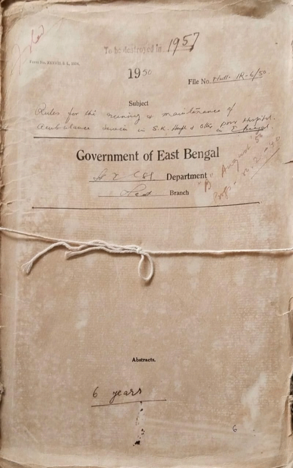 | Rack No. 09, Bundle No. 103, SI No. 8247 Rate of exchange to be adopted for the current years revised estimates and the next year's Budget estimates for charges in England. | Rack No. 09, Bundle No. 103, SI No. 8248 Sanction to the extension of tenure of the post of ward masters up this Hospital for another year with effect from I.3.48. | Rack No. 09, Bundle No. 103, SI No. 8249 Surrender of Savings out of the current year's grant and fixation of net grant. | Rack No. 09, Bundle No. 103, SI No. 8250 Rules for running and maintenance of Ambulance Service in East Bengal. | Rack No. 09, Bundle No. 104, SI No. 8251 Grant of a compensatory allowance to S.A.S. Dr. Debendra Chanda Nandy R.M.O., Eye ward, Mitford Hospital for doing double duties. | Rack No. 09, Bundle No. 104, SI No. 8252 Death of Criminal lunatic Mahendra Nath Chakrabarty. | Rack No. 09, Bundle No. 104, SI No. 8253 Appointment of Dr. Mir Mansur Ali as the teacher of Maitria Medical, Campbell Medical School. |