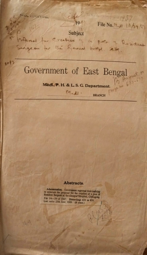 | Rack No. 09, Bundle No. 104, SI No. 8252 Death of Criminal lunatic Mahendra Nath Chakrabarty. | Rack No. 09, Bundle No. 104, SI No. 8253 Appointment of Dr. Mir Mansur Ali as the teacher of Maitria Medical, Campbell Medical School. | Rack No. 09, Bundle No. 104, SI No. 8254 Acquisition of building for Tibbia Habibia College. | Rack No. 09, Bundle No. 104, SI No. 8255 Proposal for creation of a post of Resident Surgeon for the General Hospital, Chittagong. | Rack No. 09, Bundle No. 104, SI No. 8256 Proposal for appointment of Dr. Munawarul Islam Choudhury and Dr. Abdul Mumit Choudhury. | Rack No. 09, Bundle No. 104, SI No. 8257 Provinicialization of Bogra Medical School. | Rack No. 09, Bundle No. 104, SI No. 8258 Absorption of Babu AB. Das. Assistant Chemical in the Eastern Pakistan Govt. |