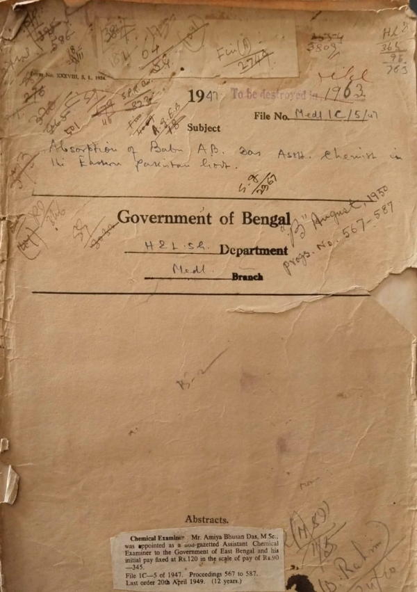 | Rack No. 09, Bundle No. 104, SI No. 8255 Proposal for creation of a post of Resident Surgeon for the General Hospital, Chittagong. | Rack No. 09, Bundle No. 104, SI No. 8256 Proposal for appointment of Dr. Munawarul Islam Choudhury and Dr. Abdul Mumit Choudhury. | Rack No. 09, Bundle No. 104, SI No. 8257 Provinicialization of Bogra Medical School. | Rack No. 09, Bundle No. 104, SI No. 8258 Absorption of Babu AB. Das. Assistant Chemical in the Eastern Pakistan Govt. | Rack No. 09, Bundle No. 104, SI No. 8259 Selection committee of the Chittagong Medical School. | Rack No. 09, Bundle No. 104, SI No. 8260 Further detention of Lunatic Fadil Mondal in Jail as a non criminal Patient. | Rack No. 09, Bundle No. 104, SI No. 8261 Allowance for staff nurses, Mitford Hospital Dacca for the year 1948-49. |