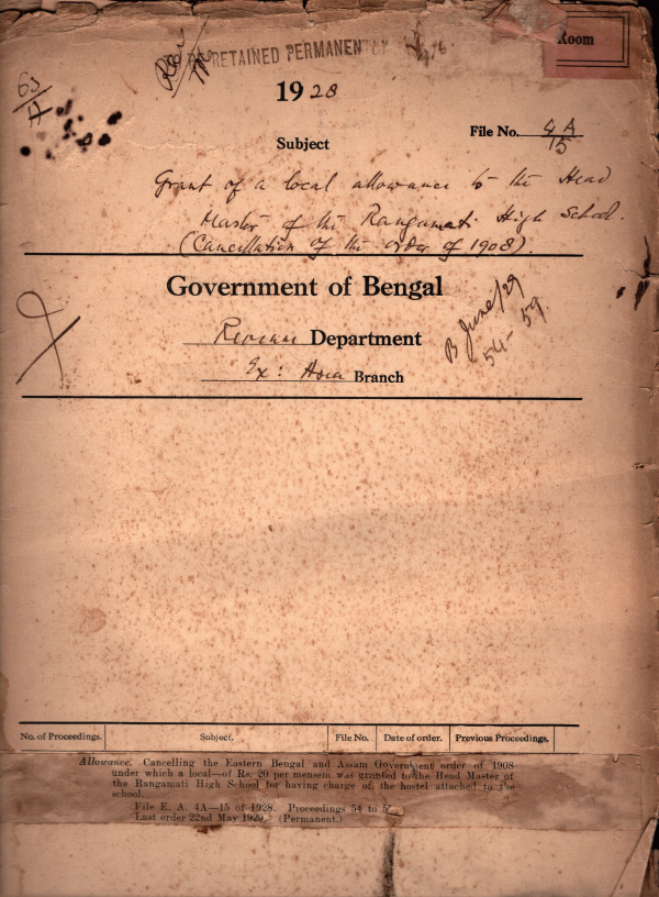 | Rack No. 37; Bundle No. 01 SL No. 42 Re-Opening at the Bandarban Subdivision in the Chittagong Hill Tracts. | Rack No. 37; Bundle No. 01 SL No. 43 Annual Contribution to the Police Hospital at Rangamati for supply of medicine to the Rangamati Sub-Jail. | Rack No. 37; Bundle No. 01 SL No. 44 Classification of the local allowances granted to the Police Force in the Chittagong Hill Tracts. | Rack No. 37; Bundle No. 01 SL No. 45 Local allowance of the Head Master at the Rangamati High School. | Rack No. 37; Bundle No. 01 SL No. 46 Retention at Certain temporary staff and maintenance of certain works in connection with the Kalimpong waterworks. | Rack No. 37; Bundle No. 01 SL No. 47 Case of prisoner Kharka Babadur Thapa. | Rack No. 37; Bundle No. 01 SL No. 48 Memorial from Babu Rohini Kanta Das Gupta late senior serving Inspector Chittagong Hill Tracts for pension. |