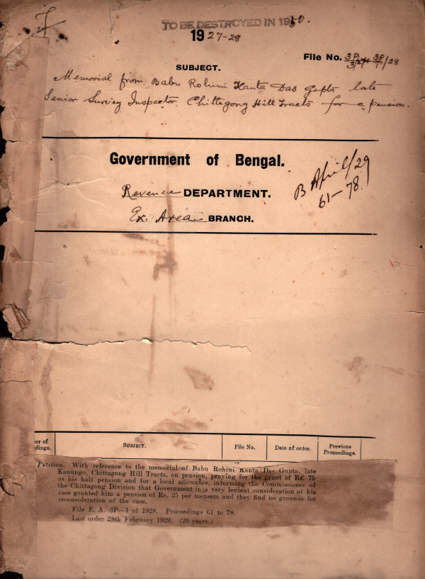 Memorial from Babu Rohini Kanta Das Gupta late senior serving Inspector Chittagong Hill Tracts for pension.