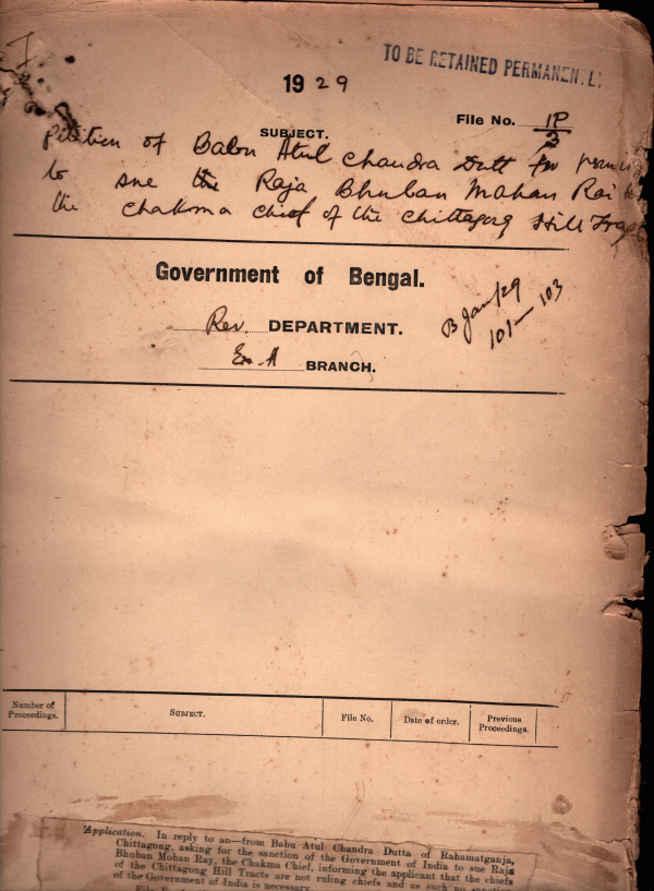 In reply to and from Babu Atul Chandra Datta of Rahamatganj a Chittagong asking for the sanction of the Government of India to sue Raja Bhuban Mohan Roy the Chakma Chief of the Chittagong Hill Tracts are not sluing Chiefs and a such no sanction of the Government of India is necessary.