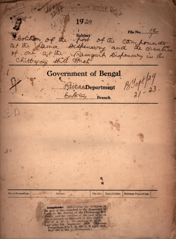Abolition at the post of the compounder at the Lama Dispensary and the Creation of one the Ramgurs Dispensary in the Chittagong Hill Tracts.