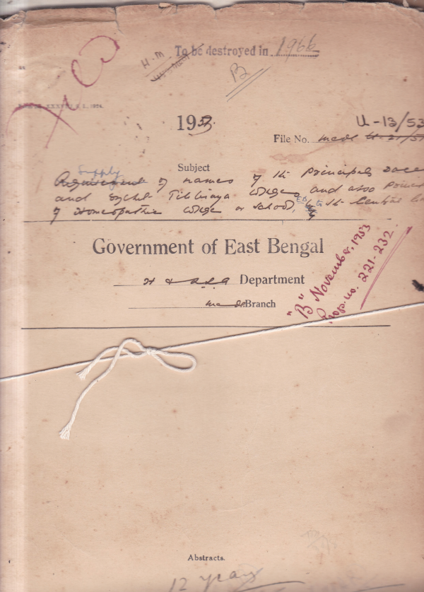 | Rack No. 10, Bundle No. 128, Sl No. 10558 Permission for transfer of passbook + Postal Saving Bank Account of Sree Manindra Nath Ghosh from Comilla to Ballygunge, Calcutta. | Rack No. 10, Bundle No. 128, Sl No. 10559 Budget references - "38 Medical for the year 1953-54". | Rack No. 10, Bundle No. 128, Sl No. 10560 Maintenance of monthly figures of both received and expenditure. | Rack No. 10, Bundle No. 128, Sl No. 10561 Supply of names of the principals Dacca and Sylhet Tibbiya College and also principal of Homeopathic College or school, E.B. to central Govt. | Rack No. 10, Bundle No. 128, Sl No. 10562 Recovery of the amount from private parties on a/c of pre-partition transaction. | Rack No. 10, Bundle No. 128, Sl No. 10563 Repairing of the Dohar out-door dispensary in the district of Dacca. | Rack No. 10, Bundle No. 128, Sl No. 10564 Appointment of the Superintendent of D.M.S. as Part time Superintendent of govt. hostels. |