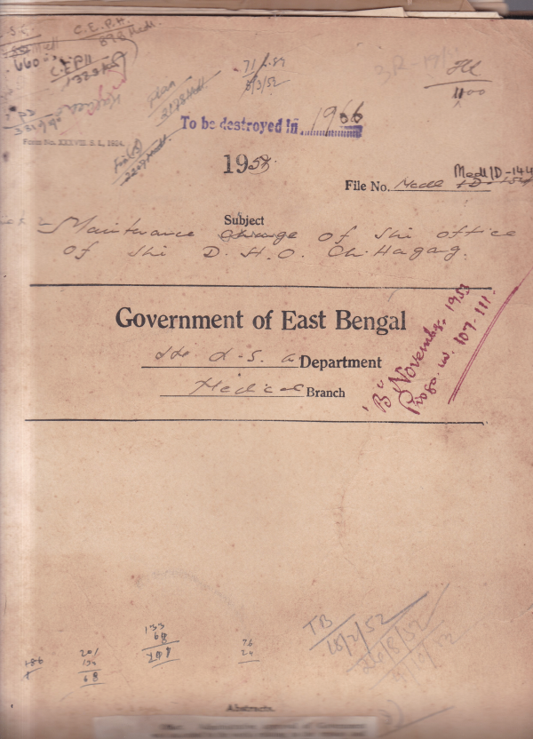 | Rack No. 10, Bundle No. 128, Sl No. 10562 Recovery of the amount from private parties on a/c of pre-partition transaction. | Rack No. 10, Bundle No. 128, Sl No. 10563 Repairing of the Dohar out-door dispensary in the district of Dacca. | Rack No. 10, Bundle No. 128, Sl No. 10564 Appointment of the Superintendent of D.M.S. as Part time Superintendent of govt. hostels. | Rack No. 10, Bundle No. 128, Sl No. 10565 Maintenance charge of the office of the D.H.O., Chittagong. | Rack No. 10, Bundle No. 128, Sl No. 10566 Counting of war service of Dr. A. Salam, teacher of Anatomy, Sylhet Medical School towards increment. | Rack No. 10, Bundle No. 128, Sl No. 10567 Utilization of the grants paid to the Chandraghona Lepers Asylum. | Rack No. 10, Bundle No. 128, Sl No. 10568 Revision of Hand book for India, Pakistan and Ceylon. |