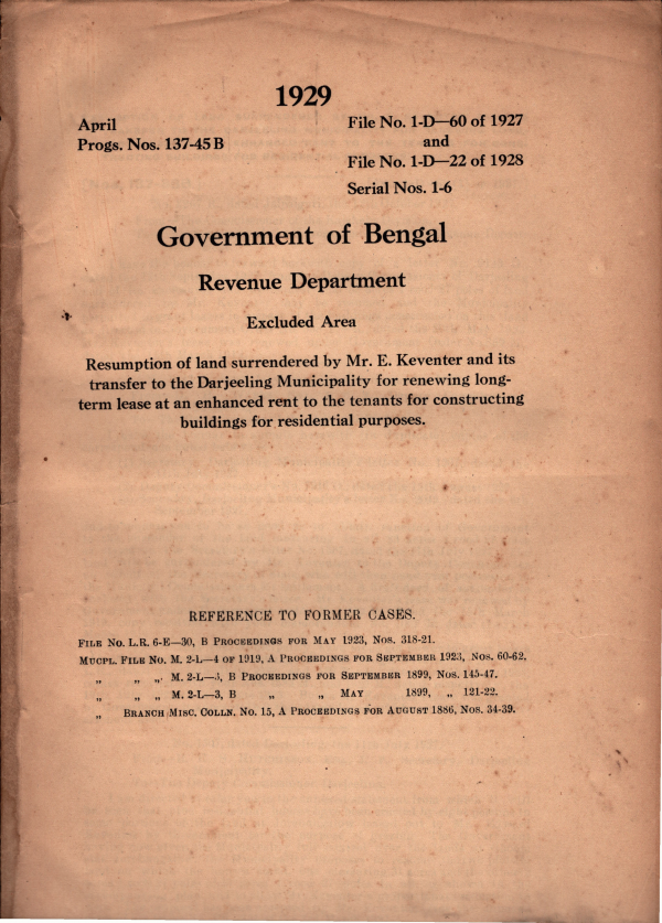 Resumption of land surrendered by Mr. E. Keventer and its transfer to the Darjeeling Musicality for renewing long-term lease at an enhanced rent to the tenants for constructing building for residential purposes.