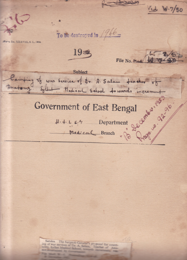 | Rack No. 10, Bundle No. 128, Sl No. 10563 Repairing of the Dohar out-door dispensary in the district of Dacca. | Rack No. 10, Bundle No. 128, Sl No. 10564 Appointment of the Superintendent of D.M.S. as Part time Superintendent of govt. hostels. | Rack No. 10, Bundle No. 128, Sl No. 10565 Maintenance charge of the office of the D.H.O., Chittagong. | Rack No. 10, Bundle No. 128, Sl No. 10566 Counting of war service of Dr. A. Salam, teacher of Anatomy, Sylhet Medical School towards increment. | Rack No. 10, Bundle No. 128, Sl No. 10567 Utilization of the grants paid to the Chandraghona Lepers Asylum. | Rack No. 10, Bundle No. 128, Sl No. 10568 Revision of Hand book for India, Pakistan and Ceylon. | Rack No. 10, Bundle No. 128, Sl No. 10569 Grants to Dispensaries for the year 1949-50 (Dacca Division). |