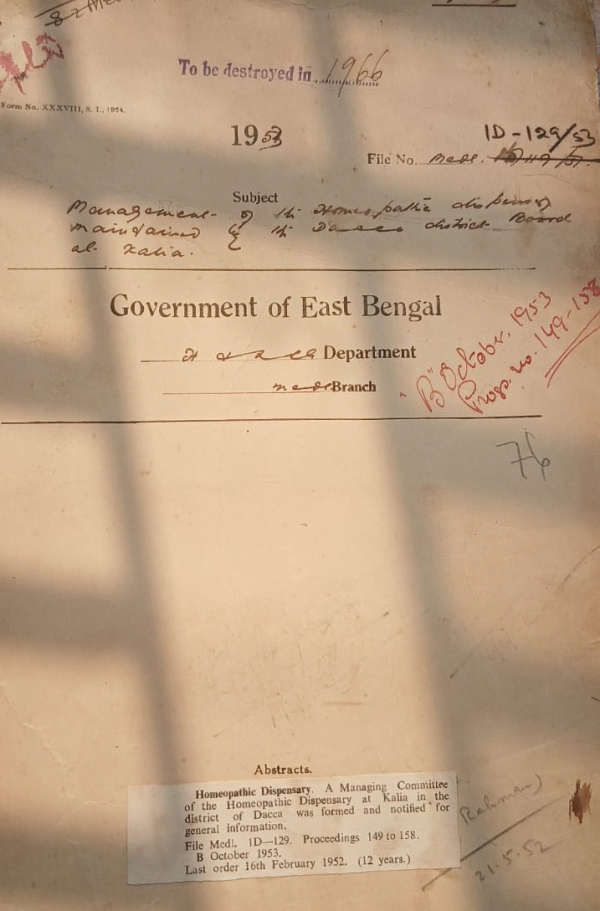 Management of the Homeopathic dispensary maintained by the Dacca District Board at Kalia.
