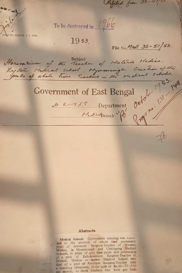 | Rack No. 10, Bundle No. 126 Sl No. 10475 Sanction to the payment of the bill @ Rs. 22/12/- only on account of the cost of a book Named Modi Medical Jarisprudence". | Rack No. 10, Bundle No. 126 Sl No. 10476 Management of the Homeopathic dispensary maintained by the Dacca District Board at Kalia. | Rack No. 10, Bundle No. 126 Sl No. 10477 Inspection remarks on the Kushtia Sadar Hospital by H.E. the govt. of East Bengal. | Rack No. 10, Bundle No. 126 Sl No. 10478 Extra duty allowance to Dr. P.C. Roy. M.B. | Rack No. 10, Bundle No. 126 Sl No. 10479 Permission to Dr. A.F. M. Abdul Majid M.B. to Publish the book entitled, "Piratical Physiological chemistry" for the student of D.M.C. D. | Rack No. 10, Bundle No. 126 Sl No. 10480 Leave of Dr. Md. Golam Kibria late teacher of surgery Chittagong Medical School. | Rack No. 10, Bundle No. 126 Sl No. 10488 Loss of govt. cycle belonging to the central Medical Stores, Tejgaon, Dacca. |