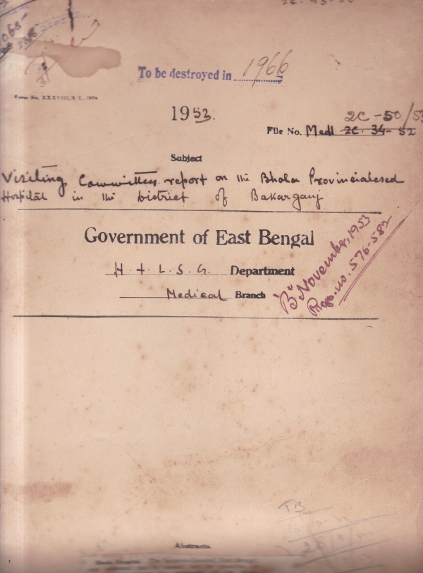 | Rack No. 10, Bundle No. 128, Sl No. 10569 Grants to Dispensaries for the year 1949-50 (Dacca Division). | Rack No. 10, Bundle No. 128, Sl No. 10570 A.Q. by Dr. A. Ahad, M.L.A. regarding the relief that have been given to Khulna by way of medicine. | Rack No. 10, Bundle No. 128, Sl No. 10571 Pharmaceutical industry in E.B. notes from Mr. M.I. Mohsinuddin Ahmed. | Rack No. 10, Bundle No. 128, Sl No. 10572 Visiting committee report on the Bhalo Prov. Hospital in the district of Bakarganj. | Rack No. 10, Bundle No. 128, Sl No. 10573 Distribution of prizes to P.T.S. Nurses worth Rs. 200/- Sanction of | Rack No. 10, Bundle No. 128, Sl No. 10574 Address to be presented to H.E. by the Faridpur District Board. | Rack No. 10, Bundle No. 128, Sl No. 10575 Requirement of rural Dispensaries + Public Health Services in respected of Land Bakarganj |