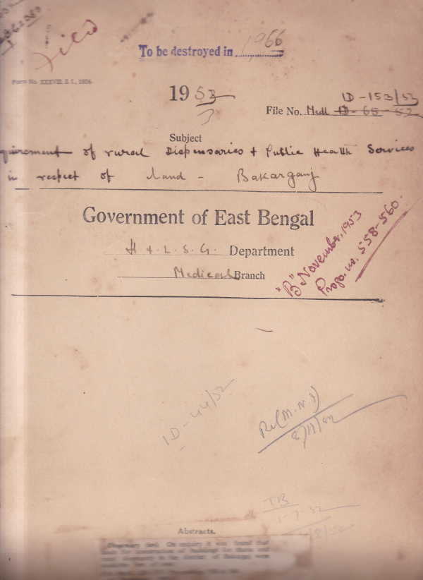 | Rack No. 10, Bundle No. 128, Sl No. 10572 Visiting committee report on the Bhalo Prov. Hospital in the district of Bakarganj. | Rack No. 10, Bundle No. 128, Sl No. 10573 Distribution of prizes to P.T.S. Nurses worth Rs. 200/- Sanction of | Rack No. 10, Bundle No. 128, Sl No. 10574 Address to be presented to H.E. by the Faridpur District Board. | Rack No. 10, Bundle No. 128, Sl No. 10575 Requirement of rural Dispensaries + Public Health Services in respected of Land Bakarganj | Rack No. 10, Bundle No. 128, Sl No. 10576 Arrear diet bills of Rangpur Prov. Hospital for 11.8.47- 14.8.47. | Rack No. 10, Bundle No. 128, Sl No. 10577 Production of ex-lunatic Nayed Ali of Balibari before the C/S. of Tippera during his stay at home. | Rack No. 10, Bundle No. 128, Sl No. 10578 Appointment of Dr. Syed A. Manan, M.B., as C/S. Kushtia. |