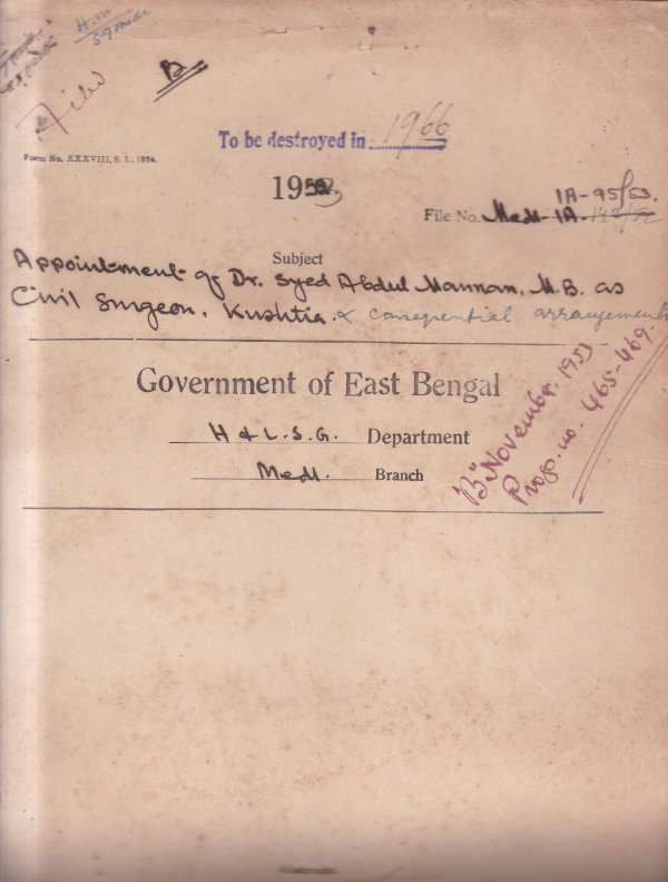 | Rack No. 10, Bundle No. 128, Sl No. 10575 Requirement of rural Dispensaries + Public Health Services in respected of Land Bakarganj | Rack No. 10, Bundle No. 128, Sl No. 10576 Arrear diet bills of Rangpur Prov. Hospital for 11.8.47- 14.8.47. | Rack No. 10, Bundle No. 128, Sl No. 10577 Production of ex-lunatic Nayed Ali of Balibari before the C/S. of Tippera during his stay at home. | Rack No. 10, Bundle No. 128, Sl No. 10578 Appointment of Dr. Syed A. Manan, M.B., as C/S. Kushtia. | Rack No. 10, Bundle No. 128, Sl No. 10579 Retention of the post of typist cum clerk in the Mitford Hospital, Dacca. | Rack No. 10, Bundle No. 128, Sl No. 10580 Resignation of Dr. Serajul Islam. E.O. Mitford Hospital, Dacca. | Rack No. 10, Bundle No. 128, Sl No. 10581 M.B.B.S. (Dacca) Recognition. |