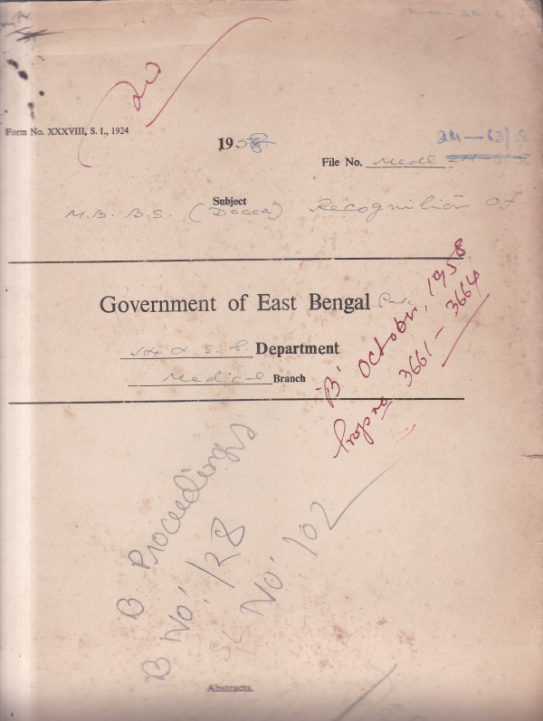 | Rack No. 10, Bundle No. 128, Sl No. 10578 Appointment of Dr. Syed A. Manan, M.B., as C/S. Kushtia. | Rack No. 10, Bundle No. 128, Sl No. 10579 Retention of the post of typist cum clerk in the Mitford Hospital, Dacca. | Rack No. 10, Bundle No. 128, Sl No. 10580 Resignation of Dr. Serajul Islam. E.O. Mitford Hospital, Dacca. | Rack No. 10, Bundle No. 128, Sl No. 10581 M.B.B.S. (Dacca) Recognition. | Rack No. 10, Bundle No. 128, Sl No. 10582 Confirmation of Dr. Zeauddin Yusuf and others. | Rack No. 10, Bundle No. 128, Sl No. 10583 Arrear bill for supply of food grains to the F.R.E. Hospital by the Chittagong Civil Supply Department for the month of January + March 1945. | Rack No. 12, Bundle No. 01 Sl No. 01 Repayment of the Calcutta Municipal Drainage Lone. |