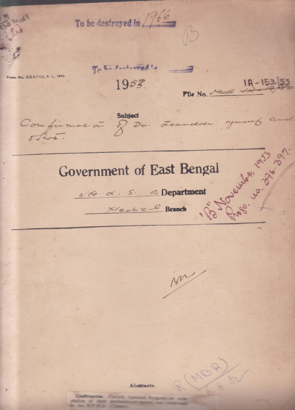 | Rack No. 10, Bundle No. 128, Sl No. 10579 Retention of the post of typist cum clerk in the Mitford Hospital, Dacca. | Rack No. 10, Bundle No. 128, Sl No. 10580 Resignation of Dr. Serajul Islam. E.O. Mitford Hospital, Dacca. | Rack No. 10, Bundle No. 128, Sl No. 10581 M.B.B.S. (Dacca) Recognition. | Rack No. 10, Bundle No. 128, Sl No. 10582 Confirmation of Dr. Zeauddin Yusuf and others. | Rack No. 10, Bundle No. 128, Sl No. 10583 Arrear bill for supply of food grains to the F.R.E. Hospital by the Chittagong Civil Supply Department for the month of January + March 1945. | Rack No. 12, Bundle No. 01 Sl No. 01 Repayment of the Calcutta Municipal Drainage Lone. | Rack No. 12, Bundle No. 01 Sl No. 02 Proposed Resumption of Proceeds from Ferries lying Wholly or Party within Municipal Limits. |