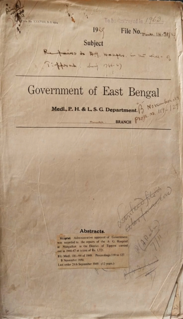 | Rack No. 09, Bundle No. 104, SI No. 8281 Creation of a post of S.A.S. for the Nawabganj Subdivision. | Rack No. 09, Bundle No. 104, SI No. 8282 Certification required from persons leaving Pakistan Instruction regarding. | Rack No. 09, Bundle No. 104, SI No. 8283 Proposal for increase of the diet rate in all provincial Hospitals in East Bengal. | Rack No. 09, Bundle No. 104, SI No. 8284 Repairs of A.G. Hospitals in the District of Tippera during (1946-49). | Rack No. 09, Bundle No. 104, SI No. 8285 Refund of security deposit of Dr. A.C. Day, Ex O/C, D.R.S., Chandpur since abolished. | Rack No. 09, Bundle No. 104, SI No. 8286 Award of scholarships to the student of the Govt. Tibbia College, Sylhet. | Rack No. 09, Bundle No. 104, SI No. 8287 Arrangement for supply of dietary articles to the 4 emergency bedded thana dispensaries under the new scheme. |