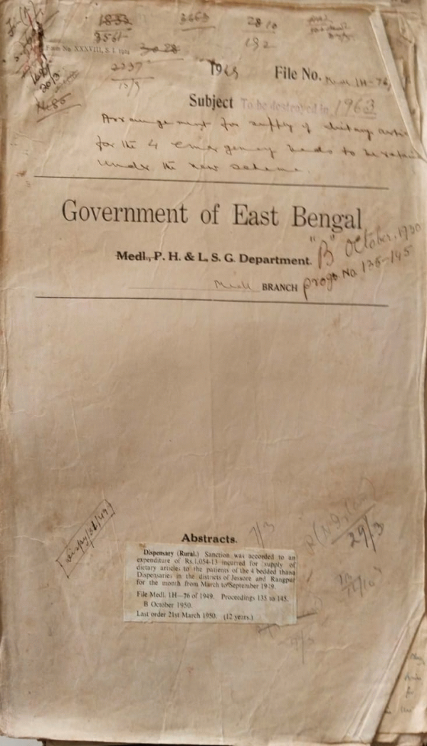 | Rack No. 09, Bundle No. 104, SI No. 8284 Repairs of A.G. Hospitals in the District of Tippera during (1946-49). | Rack No. 09, Bundle No. 104, SI No. 8285 Refund of security deposit of Dr. A.C. Day, Ex O/C, D.R.S., Chandpur since abolished. | Rack No. 09, Bundle No. 104, SI No. 8286 Award of scholarships to the student of the Govt. Tibbia College, Sylhet. | Rack No. 09, Bundle No. 104, SI No. 8287 Arrangement for supply of dietary articles to the 4 emergency bedded thana dispensaries under the new scheme. | Rack No. 09, Bundle No. 104, SI No. 8288 Extra remuneration to Dr. Altafuddin Ahmed, Additional Physician, D.M.S. for doing double duties. | Rack No. 09, Bundle No. 104, SI No. 8289 Fixation of the rates of Streptomycin Supplied to central Medical Store, Narayranganj. | Rack No. 09, Bundle No. 104, SI No. 8290 Appointment of Dr. B.L. Mondal to the post of Malaria Officer (Medical) in Malaria Institute of Pakistan, Karachi. |