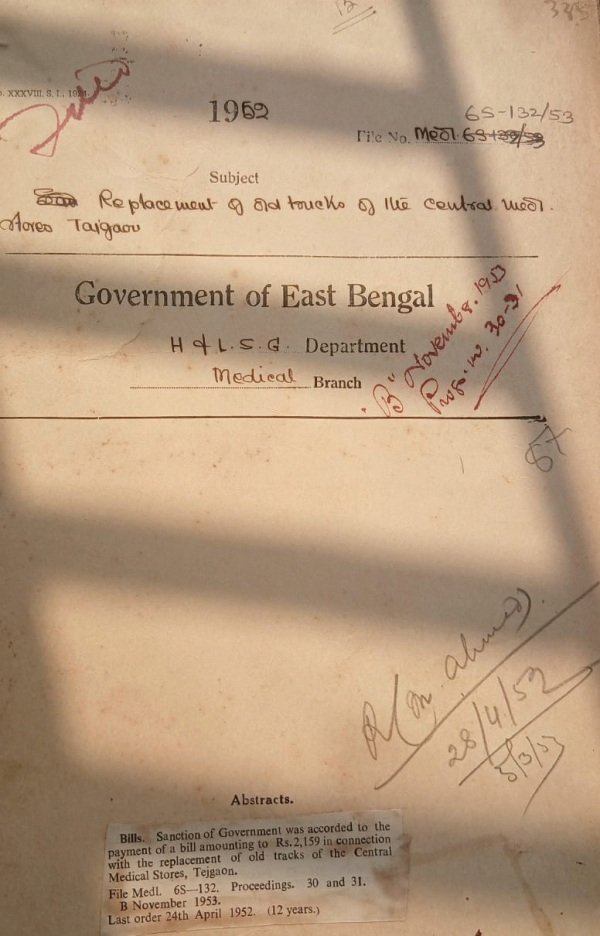 | Rack No. 10, Bundle No. 127 Sl No. 10484 Grant of compensatory Allowance to the Govt. officers of the District of Jessore. | Rack No. 10, Bundle No. 127 Sl No. 10485 Payment of arrear bills in respect of Kushtia, Chuadunga & Meherpur Hospital for the year 1951-52. | Rack No. 10, Bundle No. 127 Sl No. 10486 Award of Scholarship to the Students of the D.M.S. during 1952-53. | Rack No. 10, Bundle No. 127 Sl No. 10487 Replacement of old trucks of the central Medical Stores, Tejgaon. | Rack No. 10, Bundle No. 127 Sl No. 10489 Credit of certain fund in postal saving Bundle permission to C/S. Sylhet regarding. | Rack No. 10, Bundle No. 127 Sl No. 10490 Fixation of pay of Dr. Q.A. Khaleque, Prof. of Phonology, D.M.C. | Rack No. 10, Bundle No. 127 Sl No. 10491 Permission to Dr. A.K.M. Hafiqur Rahman M.B. officiating C/S. Bogra to insert "Syed" before his name. |