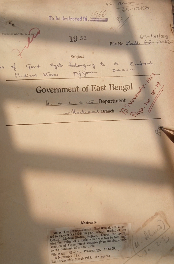 | Rack No. 10, Bundle No. 126 Sl No. 10478 Extra duty allowance to Dr. P.C. Roy. M.B. | Rack No. 10, Bundle No. 126 Sl No. 10479 Permission to Dr. A.F. M. Abdul Majid M.B. to Publish the book entitled, "Piratical Physiological chemistry" for the student of D.M.C. D. | Rack No. 10, Bundle No. 126 Sl No. 10480 Leave of Dr. Md. Golam Kibria late teacher of surgery Chittagong Medical School. | Rack No. 10, Bundle No. 126 Sl No. 10488 Loss of govt. cycle belonging to the central Medical Stores, Tejgaon, Dacca. | Rack No. 10, Bundle No. 126 Sl No. 10502 Addition and a Herations to the C.M.S. at Tejgaon. | Rack No. 10, Bundle No. 1267Sl No. 10492 Confiscated Drugs Taking over of | Rack No. 10, Bundle No. 127 Sl No. 10481 The Lunacy Bill by Mr. Nur Ahmed, Constituent Assembly of Pakistan. |