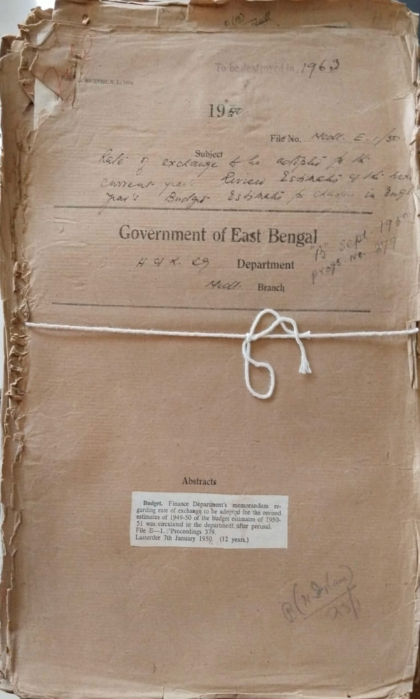 | Rack No. 09, Bundle No. 104, SI No. 8307 Allegation against the teacher of Anatomy, Chittagong Medical School by the Students. | Rack No. 09, Bundle No. 104, SI No. 8308 Installation of a telephone in the emergency room of the S.K. Hospital, Mymensingh. | Rack No. 09, Bundle No. 104, SI No. 8309 Entertainment of two Sweepers and two ward boys in the Mitford Hospital, Dacca. | Rack No. 09, Bundle No. 104, SI No. 8310 Rate of Exchange to be adopted for the current years revised estimates of the next year's budget. | Rack No. 09, Bundle No. 104, SI No. 8311 Payment on a/c of Govt. Of India Securities Devaluation of Indian Currency. | Rack No. 09, Bundle No. 104, SI No. 8312 Sanction to the Payment for the purchase of a battery for fire engine of the central Medical Store, Tejgaon. | Rack No. 09, Bundle No. 104, SI No. 8313 Acquisition of Land for the Norupur Ch. Dispensary in the District of Chittagong. |