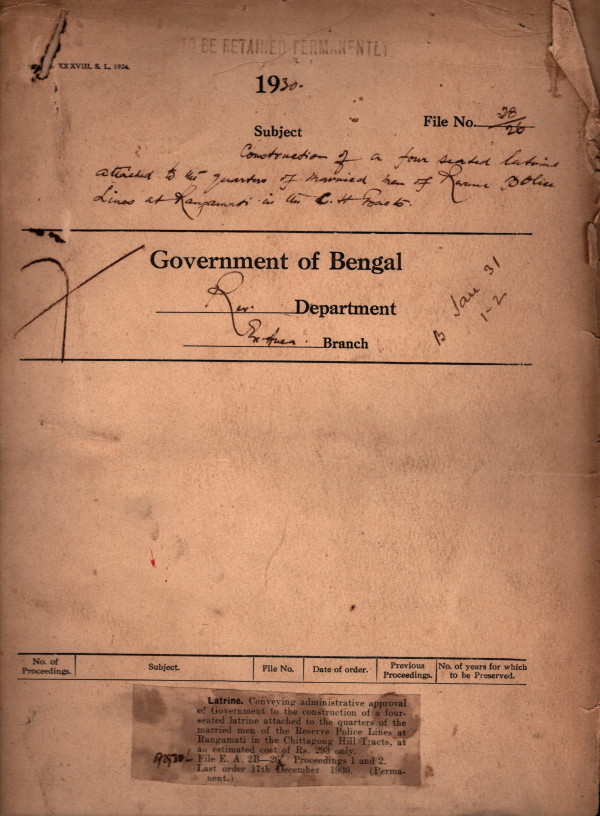 Conveying administration approval of Government to the Construction at a four seated latrine attached to the quarters of the married men at the Reserve Police Lines at Rangamati in the Chittagong Hill Tracts at an estimated cost of Rs. 293 only.