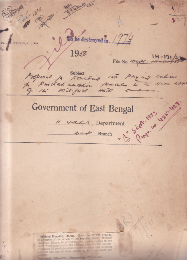 | Rack No. 10, Bundle No. 123, Sl No. 10249 Recovery of Rs. 14/- from Dr. J.M. Palit, M.B., C/S. Goalpara, Assam. | Rack No. 10, Bundle No. 123, Sl No. 10250 Creation of the post. of Mechanic for the M.C.H. Dacca. | Rack No. 10, Bundle No. 124, Sl No. 10251 Countess of duffer in fund, Bengal Fund regarding towards the maintenance of Vidyananyee outdoor dispensary Mymensingh. | Rack No. 10, Bundle No. 124, Sl No. 10252 Proposal for providing two paying Cabins for purdahnashin females in the Hare word. | Rack No. 10, Bundle No. 124, Sl No. 10253 Audit report on the accounts of the famine relief expenditure including free Hospital Khulna to Sadar hospital. | Rack No. 10, Bundle No. 124, Sl No. 10254 Provincial hospital Kishrgonj by the local multipurpose society. | Rack No. 10, Bundle No. 124, Sl No. 10255 The total member of surgeons in pakistan 1951 and the steps taken producing more export Surgeons. |