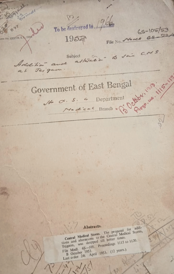 | Rack No. 10, Bundle No. 126 Sl No. 10479 Permission to Dr. A.F. M. Abdul Majid M.B. to Publish the book entitled, "Piratical Physiological chemistry" for the student of D.M.C. D. | Rack No. 10, Bundle No. 126 Sl No. 10480 Leave of Dr. Md. Golam Kibria late teacher of surgery Chittagong Medical School. | Rack No. 10, Bundle No. 126 Sl No. 10488 Loss of govt. cycle belonging to the central Medical Stores, Tejgaon, Dacca. | Rack No. 10, Bundle No. 126 Sl No. 10502 Addition and a Herations to the C.M.S. at Tejgaon. | Rack No. 10, Bundle No. 1267Sl No. 10492 Confiscated Drugs Taking over of | Rack No. 10, Bundle No. 127 Sl No. 10481 The Lunacy Bill by Mr. Nur Ahmed, Constituent Assembly of Pakistan. | Rack No. 10, Bundle No. 127 Sl No. 10483 Posting of Dr. S. Hasan, Nizamuddin Talukder and Abdul Majid. |