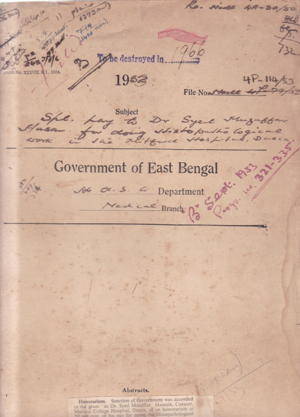 | Rack No. 10, Bundle No. 124, Sl No. 10259 Receiving of the medical officer in charge of the Debigonj dispensary of the Charitable Estate Dinajpur. | Rack No. 10, Bundle No. 124, Sl No. 10260 Selection committee for admission of students to Lytton medical school Mymensingh. | Rack No. 10, Bundle No. 124, Sl No. 10261 Theft from D.R.S. | Rack No. 10, Bundle No. 124, Sl No. 10262 Sanction of govt. to the grant to Dr. Syed Mozaffar Hossain Curator D.M.C. Dacca. | Rack No. 10, Bundle No. 124, Sl No. 10263 Adjustment of shortage in cash and meterail against govt. Servant of undivided Bengal on the date of Petition. | Rack No. 10, Bundle No. 124, Sl No. 10264 Appointment of Majon F.W. Allusion Ex. I.M.S. as profession of surgery D.M.C. | Rack No. 10, Bundle No. 124, Sl No. 10265 Contribution payable by the Shlhet Municipality towards the Sadar Hospital Sylhet. |