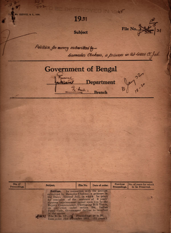 | Rack No. 37; Bundle No. 02 SL No. 85 Memorial of Kumar Ramani Mohan Roy | Rack No. 37; Bundle No. 02 SL No. 86 Rearmament of the Police force in the Chittagong Hill Tracts. | Rack No. 37; Bundle No. 02 SL No. 87 Resumption of the Rangamati Chittagong Road by Public Works Department in the office from 1 April 1931. | Rack No. 37; Bundle No. 02 SL No. 88 Petition for mercy submitted by Damadar Chakma a prisoner in the Dacca Central Jail. | Rack No. 37; Bundle No. 02 SL No. 89 Petition for mercy submitted by Mamfaong Magh, a prisoner in the Dacca CE. Jail. | Rack No. 37; Bundle No. 02 SL No. 90 Petition for mercy submitted by Nilmani Chakma, a prisoner in the Dacca Central Jail. | Rack No. 37; Bundle No. 02 SL No. 91 Petition for Marcy submitted by Jhowain Kyang Magh, a Prisoner in the Dacca Central Jail. |