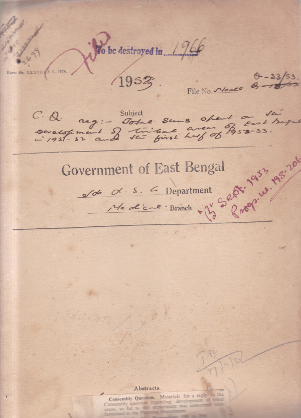 | Rack No. 10, Bundle No. 124, Sl No. 10263 Adjustment of shortage in cash and meterail against govt. Servant of undivided Bengal on the date of Petition. | Rack No. 10, Bundle No. 124, Sl No. 10264 Appointment of Majon F.W. Allusion Ex. I.M.S. as profession of surgery D.M.C. | Rack No. 10, Bundle No. 124, Sl No. 10265 Contribution payable by the Shlhet Municipality towards the Sadar Hospital Sylhet. | Rack No. 10, Bundle No. 124, Sl No. 10266 Consumable Questions regarding development of Tribal area. | Rack No. 10, Bundle No. 124, Sl No. 10267 Submission of received for 1952-53 and Budget estimates 153-54 to A.G. and Finance department. | Rack No. 10, Bundle No. 124, Sl No. 10268 Forecast budget estimate 1953-54 under change in England. | Rack No. 10, Bundle No. 124, Sl No. 10269 Sanction to the advancement to change for Filling of the host dental of D.M.C. Dacca. |