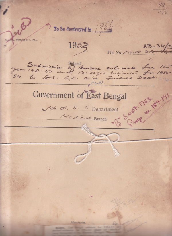 | Rack No. 10, Bundle No. 124, Sl No. 10264 Appointment of Majon F.W. Allusion Ex. I.M.S. as profession of surgery D.M.C. | Rack No. 10, Bundle No. 124, Sl No. 10265 Contribution payable by the Shlhet Municipality towards the Sadar Hospital Sylhet. | Rack No. 10, Bundle No. 124, Sl No. 10266 Consumable Questions regarding development of Tribal area. | Rack No. 10, Bundle No. 124, Sl No. 10267 Submission of received for 1952-53 and Budget estimates 153-54 to A.G. and Finance department. | Rack No. 10, Bundle No. 124, Sl No. 10268 Forecast budget estimate 1953-54 under change in England. | Rack No. 10, Bundle No. 124, Sl No. 10269 Sanction to the advancement to change for Filling of the host dental of D.M.C. Dacca. | Rack No. 10, Bundle No. 124, Sl No. 10270 Proposal for re3ation of the post of a midwife in each of Sub-divisional proved. Hospital. |