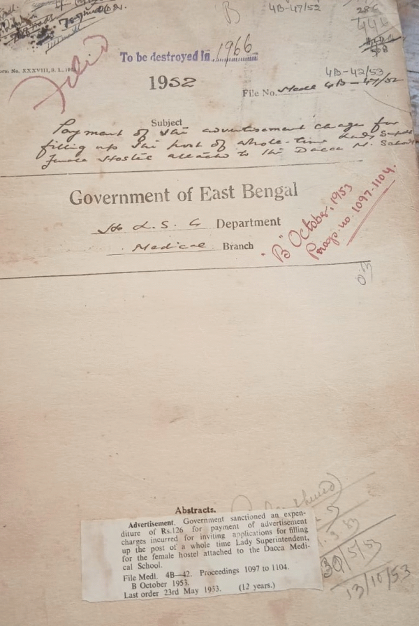 | Rack No. 10, Bundle No. 127 Sl No. 10498 Chemical surgical + Post Mortem Exam of armed forces payment of fees. | Rack No. 10, Bundle No. 127 Sl No. 10499 Appointment of Dr. S. Fazlul Haque as Emergency officer of D.M.C.H. for the period from 26.5.52 to 15.6.52. | Rack No. 10, Bundle No. 127 Sl No. 10501 Free Supply of Chloramycetine to Jalaluddin, a ward boy of the D.M.C.H. | Rack No. 10, Bundle No. 127 Sl No. 10503 Payment of advertisement charges for filling up the post of whole time lady superintendent for the female hostel attached to D.M.S. | Rack No. 10, Bundle No. 127 Sl No. 10504 Payment of the bill to Mr. S. Rahman for supplying and fitting 6 air light teak boxes in the D.M.C. | Rack No. 10, Bundle No. 127 Sl No. 10505 Permission to C/S. Noakhali for using he Ambulance as a Spl. to allow the Jail+ Police Hospital. | Rack No. 10, Bundle No. 127 Sl No. 10506 Payment of advertisement bill of Morning News in connection with the recruiting of one Assistant Chemical Examiner. |