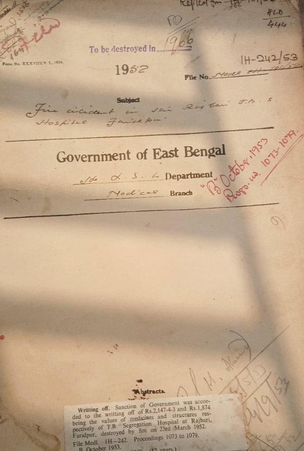 | Rack No. 10, Bundle No. 127 Sl No. 10506 Payment of advertisement bill of Morning News in connection with the recruiting of one Assistant Chemical Examiner. | Rack No. 10, Bundle No. 127 Sl No. 10507 Mymensingh Discontinuance of constitution by the Kishorganj Municipality to Kishorganj Sub-Divisional Hospital. | Rack No. 10, Bundle No. 127 Sl No. 10508 Gift of certain medical books by friends service unit + friends centre, 7, Barada Ganguly Lane. | Rack No. 10, Bundle No. 127 Sl No. 10509 Fire incident in the Rajbari T.B.S. Hospital, Faridpur. | Rack No. 10, Bundle No. 127 Sl No. 10510 Storm damage repair to the T.B.S. Hospital at Feni, Noakhali District. | Rack No. 10, Bundle No. 127 Sl No. 10511 Higher Medical Training Abroad Dr. Nural Islam. | Rack No. 10, Bundle No. 127 Sl No. 10512 Sanction of stipends to the Midwifery Training class in the Mitford Hospital, Dacca. |