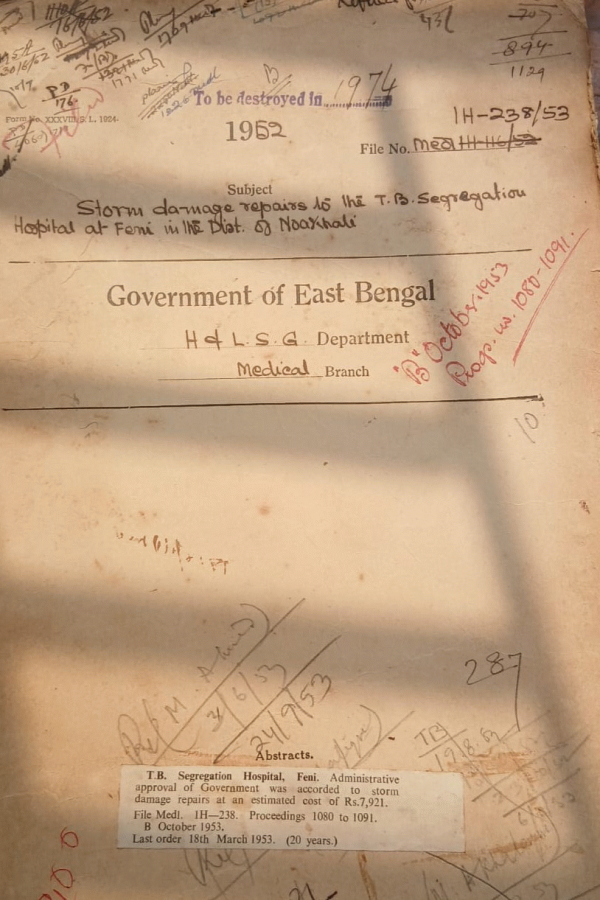 | Rack No. 10, Bundle No. 127 Sl No. 10507 Mymensingh Discontinuance of constitution by the Kishorganj Municipality to Kishorganj Sub-Divisional Hospital. | Rack No. 10, Bundle No. 127 Sl No. 10508 Gift of certain medical books by friends service unit + friends centre, 7, Barada Ganguly Lane. | Rack No. 10, Bundle No. 127 Sl No. 10509 Fire incident in the Rajbari T.B.S. Hospital, Faridpur. | Rack No. 10, Bundle No. 127 Sl No. 10510 Storm damage repair to the T.B.S. Hospital at Feni, Noakhali District. | Rack No. 10, Bundle No. 127 Sl No. 10511 Higher Medical Training Abroad Dr. Nural Islam. | Rack No. 10, Bundle No. 127 Sl No. 10512 Sanction of stipends to the Midwifery Training class in the Mitford Hospital, Dacca. | Rack No. 10, Bundle No. 127 Sl No. 10513 The Sir Salimullah Moslem orphanage Dacca Training of elderly girls in nursing. |