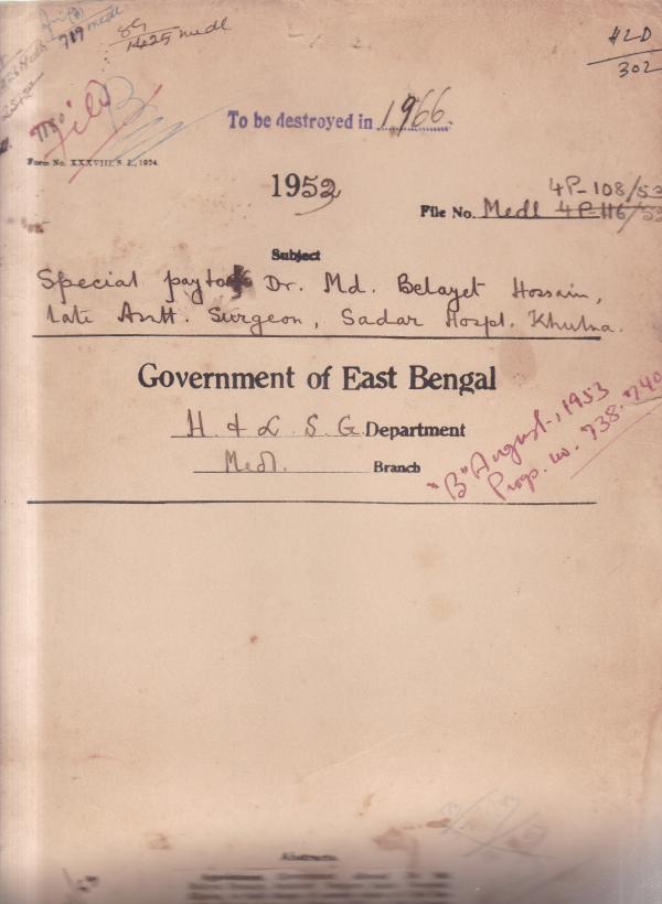 Special pay of Dr. Belayet Hossain late A.S. Sadar Hospital Khulna.
